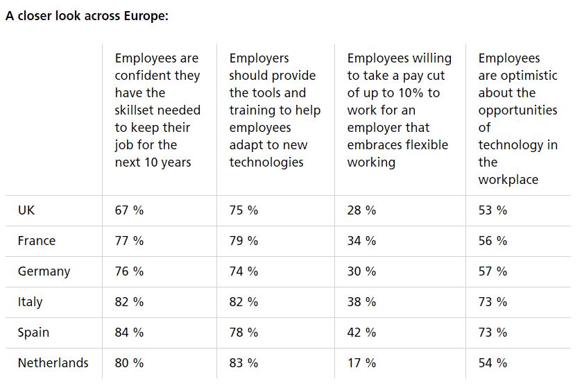 Despite the fact that automation and technology are likely to replace certain jobs in the future, a Ricoh Europe study of 3,000 European workers found that employees are open to the potential benefits that come with these changes. The majority (61%) are optimistic about the opportunities that technology will bring to the workplace, enabling them to work more flexibly and collaboratively. More than three-quarters (77%) are also confident that they have the necessary skillset to keep and progress their current job over the next ten years.